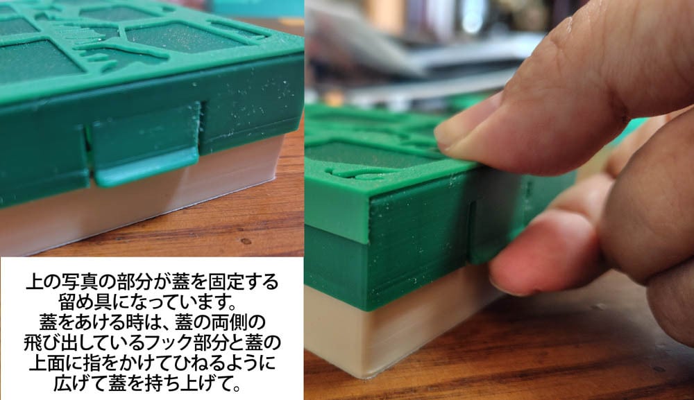 蓋の部分は左右のフックと本体の溝でロックする形式になっています。